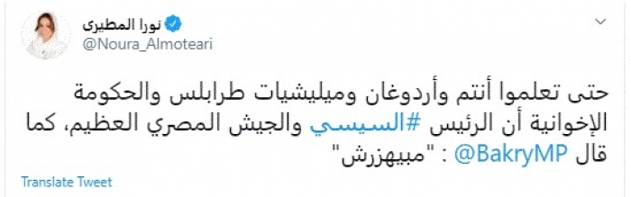 وقال في تغريدة عبر "تويتر" رصدها "المشهد العربي": "حتى تعلموا أنتم وأردوغان وميليشيات طرابلس والحكومة الإخوانية أن الرئيس السيسي والجيش المصري العظيم، كما قال مصطفى بكري: مبيهزرش".