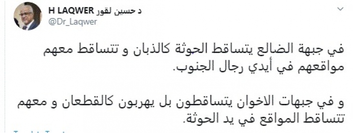وكتب في تغريدة عبر "تويتر" رصدها "المشهد العربي": "في جبهة الضالع يتساقط الحوثة كالذبان وتتساقط معهم مواقعهم في أيدي رجال الجنوب".