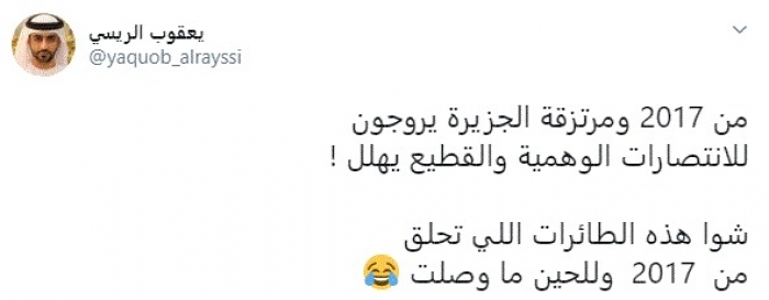 وقال في تغريدة عبر "تويتر" رصدها "المشهد العربي": "من 2017 ومرتزقة الجزيرة يروجون للانتصارات الوهمية والقطيع يهلل".