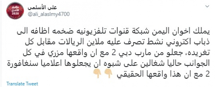 وقال في تغريدة عبر "تويتر" رصدها "المشهد العربي": "يملك إخوان اليمن شبكة قنوات تلفزيونية ضخمة إضافة إلى ذباب إلكتروني نشط تصرف عليه ملايين الريالات مقابل كل تغريدة".