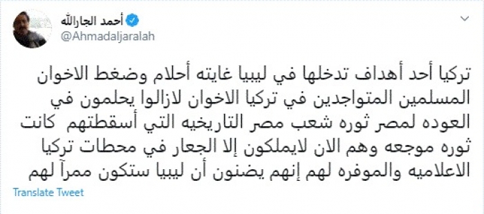 وقال في تغريدة عبر "تويتر" رصدها "المشهد العربي": "تركيا أحد أهداف تدخلها في ليبيا غايته أحلام وضغط الإخوان المسلمين المتواجدين في تركيا".