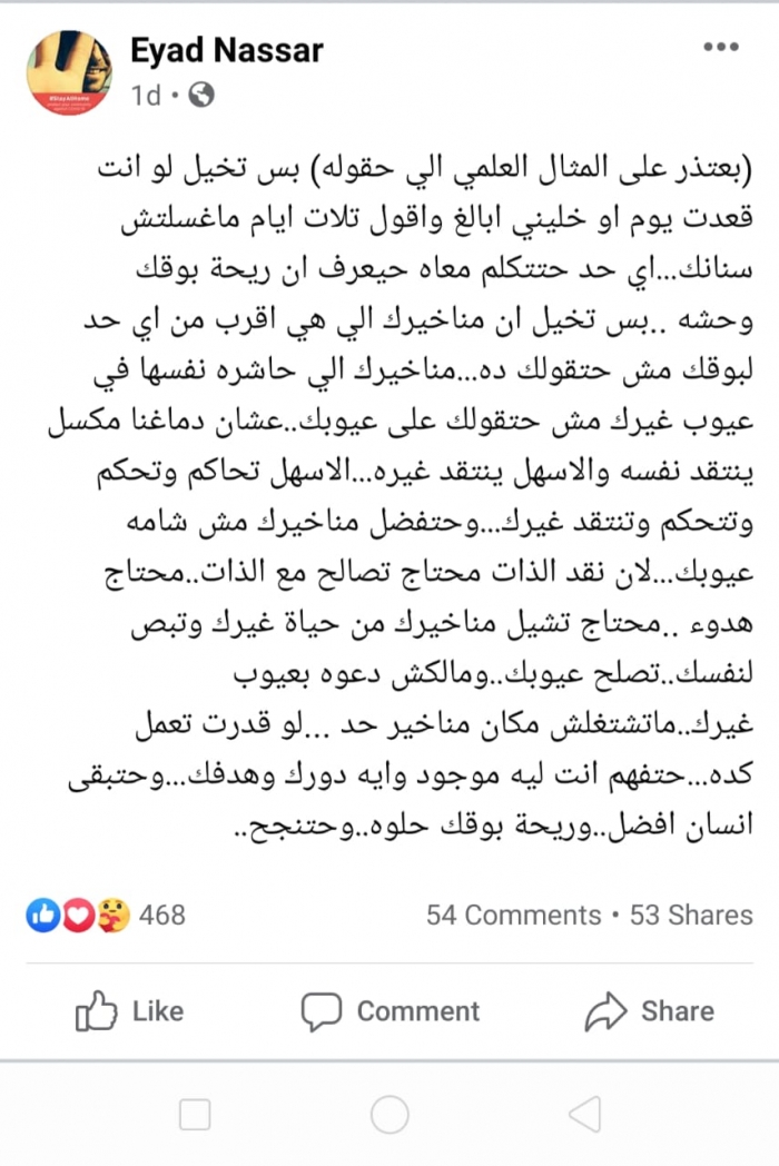 أضاف نصار: "محتاج تصلح عيوبك، ومالكش دعوة بعيوب غيرك، ماتشتغلش مكان مناخير حد، لو قدرت تعمل كده هتفهم انت ليه موجود وايه دورك وهدفك، وهتبقى إنسان أفضل.. وريحة بوقك حلوة وهتنجح".