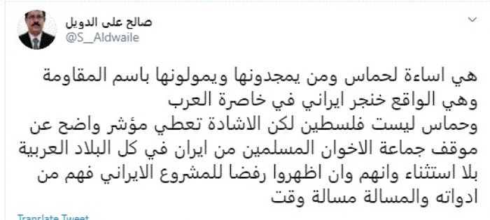 وقال في تغريدة عبر "تويتر" رصدها "المشهد العربي": "هي إساءة لحماس ومن يمجدونها ويمولونها باسم المقاومة وهي الواقع خنجر إيراني في خاصرة العرب".