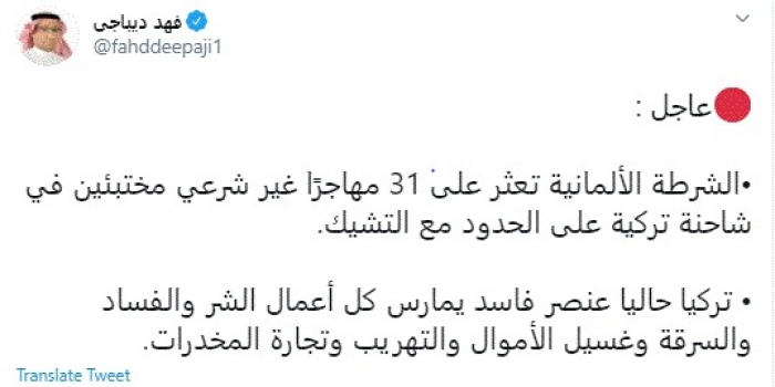 وقال في تغريدة عبر "تويتر" رصدها "المشهد العربي": "الشرطة الألمانية تعثر على 31 مهاجرًا غير شرعي مختبئين في شاحنة تركية على الحدود مع التشيك".