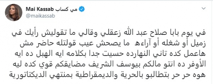 وغردت "مي"، عبر حسابها بـ"تويتر"، قائلة: "في يوم بابا صلاح عبدالله زعقلي وقالي ما تقوليش رأيك في زميل أو شغله أو آراءه ما يصحش عيب قولتله حاضر مش هاعمل كده تاني".