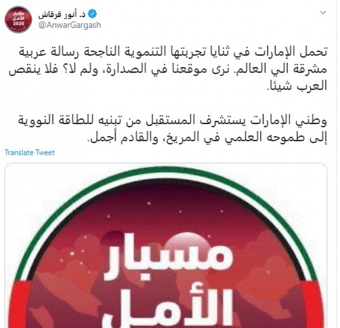 أشاد وزير الدولة الإماراتي للشؤون الخارجية الدكتور أنور قرقاش، اليوم، بالإنجاز الإماراتي الجديد مسبار الأمل.