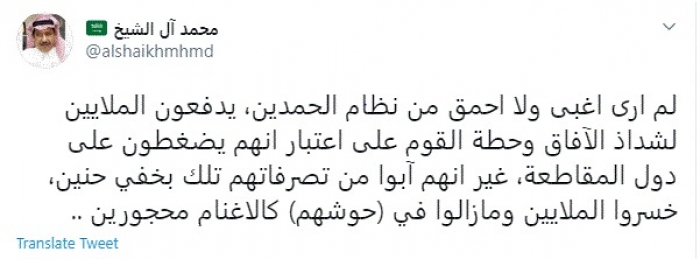 وقال في تغريدة عبر "تويتر" رصدها "المشهد العربي": "لم أرى أغبى ولا أحمق من نظام الحمدين، يدفعون الملايين لشداذ الآفاق وحطة القوم على اعتبار أنهم يضغطون على دول المقاطعة".