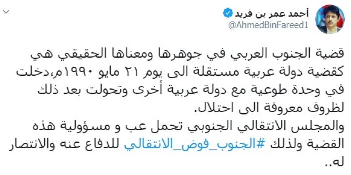 وكتب عبر تغريدة له على "تويتر" رصدها "المشهد العربي": "قضية الجنوب العربي في جوهرها ومعناها الحقيقي هي كقضية دولة عربية مستقلة، إلى يوم 21 مايو 1990م، دخلت في وحدة طوعية مع دولة عربية أخرى وتحولت بعد ذلك لظروف معروفة إلى احتلال.