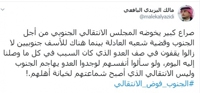 وكتب عبر تغريدة له على "تويتر" رصدها "المشهد العربي": "صراع كبير يخوضه المجلس الانتقالي الجنوبي من أجل الجنوب وقضية شعبه العادلة، بينما هناك للأسف جنوبيون لا زالوا يقفون في صف العدو الذي كان السبب في كل ما وصلنا إليه اليوم، ولو سألوا أنفسهم لوجدوا العدو يهاجم الجنوب وليس الانتقالي الذي أصبح شماعتهم لخيانة أهلهم".