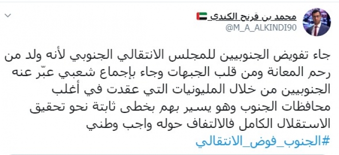 وكتب عبر تغريدة له على "تويتر" رصدها "المشهد العربي": "جاء تفويض الجنوبيين للمجلس الانتقالي الجنوبي لأنه ولد من رحم المعاناة ومن قلب الجبهات وجاء بإجماع شعبي عبّر عنه الجنوبيون من خلال المليونيات التي عقدت في أغلب محافظات الجنوب وهو يسير بهم بخطى ثابتة نحو تحقيق الاستقلال الكامل، فالالتفاف حوله واجب وطني".