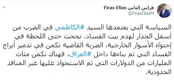 وكتب عبر تغريدة له على "تويتر" رصدها " المشهد العربي": "السياسة التي يعتمدها السيد الكاظمي في الضرب من أسفل الجدار لهدم بيت الفساد، نجحت حتى اللحظة في احتواء الأسوار الخارجية، الضربة القاضية تكمن في تدمير أبراج الفساد التي تم بناءها داخل العراق، فهناك تكمن مئات المليارات من الدولارات التي تم الاستحواذ عليها عبر المنافذ الحدودية".