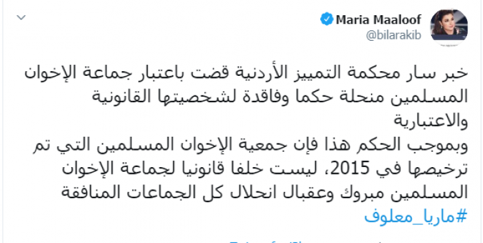 وكتبت عبر تغريدة لها على "تويتر" رصدها " المشهد العربي": "خبر سار محكمة التمييز الأردنية قضت باعتبار جماعة الإخوان المسلمين منحلة حكما وفاقدة لشخصيتها القانونية والاعتبارية، وبموجب الحكم هذا فإن جمعية الإخوان المسلمين التي تم ترخيصها في 2015، ليست خلفا قانونيا لجماعة الإخوان المسلمين، مبروك وعقبال انحلال كل الجماعات المنافقة".
