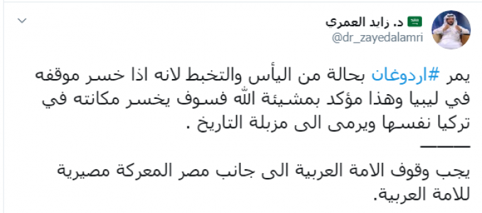 وكتب عبر تغريدة له على "تويتر" رصدها " المشهد العربي": "يمر أردوغان بحالة من اليأس والتخبط لأنه إذا خسر موقفه في ليبيا وهذا مؤكد بمشيئة الله فسوف يخسر مكانته في تركيا نفسها ويرمى إلى مزبلة التاريخ، يجب وقوف الأمة العربية إلى جانب مصر المعركة مصيرية للأمة العربية".