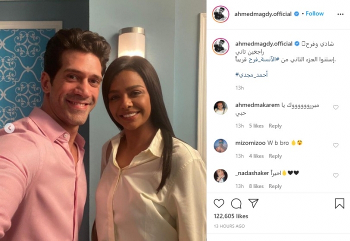ونشر مجدي، صورا له مع أسماء أبو اليزيد، عبر حسابه على إنستجرام، وعلق: "شادي وفرح راجعين تاني.. استنوا الجزء الثاني من الأنسة فرح قريباً".