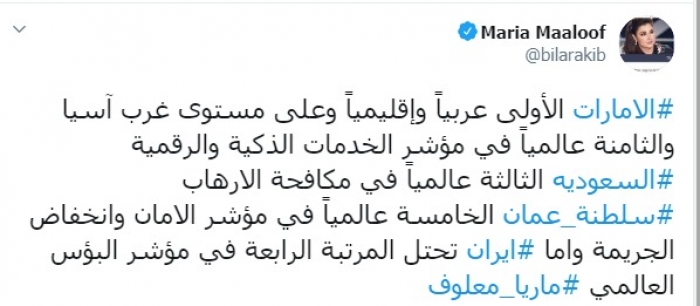 وكتبت عبر تغريدة لها على "تويتر" رصدها " المشهد العربي": "الإمارات الأولى عربياً وإقليمياً وعلى مستوى غرب آسيا والثامنة عالمياً في مؤشر الخدمات الذكية والرقمية، السعودية الثالثة عالمياً في مكافحة الإرهاب، سلطنة عمان الخامسة عالمياً في مؤشر الأمان وانخفاض الجريمة، وأما إيران تحتل المرتبة الرابعة في مؤشر البؤس العالمي".