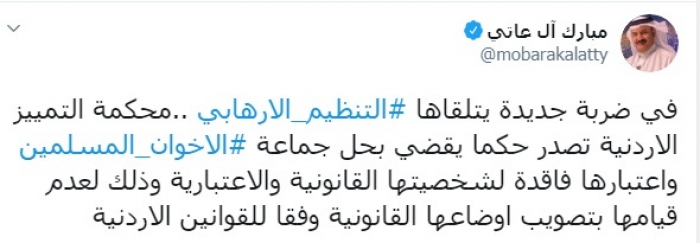 وكتب عبر تغريدة له على "تويتر" رصدها " المشهد العربي":"في ضربة جديدة يتلقاها التنظيم الإرهابي، محكمة التمييز الأردنية تصدر حكما يقضي بحل جماعة الإخوان المسلمين واعتبارها فاقدة لشخصيتها القانونية والاعتبارية وذلك لعدم قيامها بتصويب أوضاعها القانونية وفقا للقوانين الأردنية".