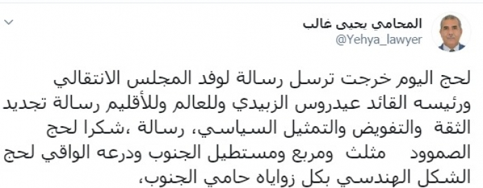 وكتب عبر تغريدة له على "تويتر" رصدها " المشهد العربي": "لحج اليوم خرجت ترسل رسالة لوفد المجلس الانتقالي ورئيسه القائد عيدروس الزُبيدي وللعالم وللإقليم رسالة تجديد الثقة والتفويض والتمثيل السياسي، رسالة، شكرًا لحج الصمود مثلث ومربع ومستطيل الجنوب ودرعه الواقي لحج الشكل الهندسي بكل زواياه حامي الجنوب".