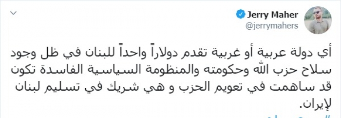 وكتب عبر تغريدة له على "تويتر" رصدها " المشهد العربي": "أي دولة عربية أو غربية تقدم دولاراً واحداً للبنان في ظل وجود سلاح حزب الله وحكومته والمنظومة السياسية الفاسدة تكون قد ساهمت في تعويم الحزب و هي شريك في تسليم لبنان لإيران".