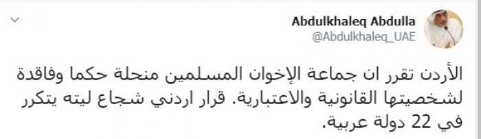 وكتب عبر تغريدة له على "تويتر" رصدها " المشهد العربي": "الأردن تقرر أن جماعة الإخوان المسلمين منحلة حكما وفاقدة لشخصيتها القانونية والاعتبارية، قرار أردني شجاع ليته يتكرر في 22 دولة عربية".