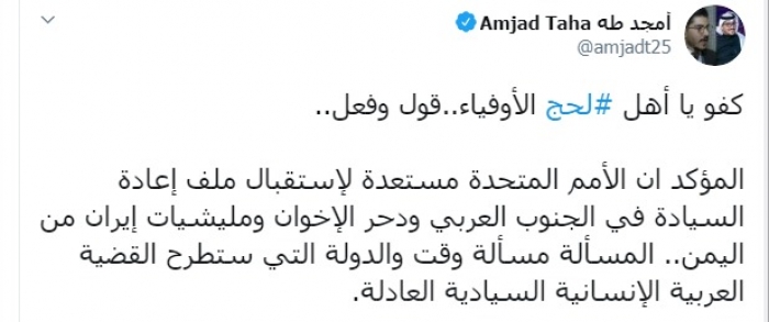وكتب عبر تغريدة له على "تويتر" رصدها " المشهد العربي": "كفو يا أهل لحج الأوفياء، قولًا وفعلًا، المؤكد ان الأمم المتحدة مستعدة لاستقبال ملف إعادة السيادة في الجنوب العربي ودحر الإخوان ومليشيات إيران من اليمن، المسألة مسألة وقت والدولة التي ستطرح القضية العربية الإنسانية السيادية العادلة".