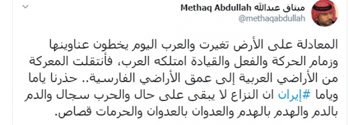 وكتب عبر تغريدة له على "تويتر" رصدها "المشهد العربي": "المعادلة على الأرض تغيرت والعرب اليوم يخطون عناوينها وزمام الحركة والفعل والقيادة امتلكه العرب، فانتقلت المعركة من الأراضي العربية إلى عمق الأراضي الفارسية، حذرنا ياما وياما إيران أن النزاع لا يبقى على حال والحرب سجال والدم بالدم والهدم بالهدم والعدوان بالعدوان والحرمات قصاص".