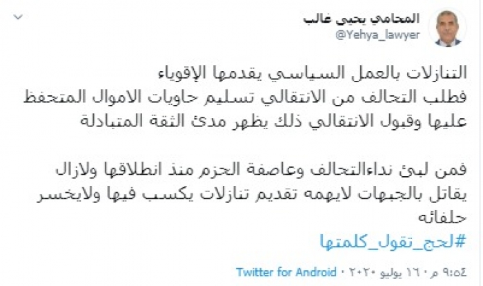 واختتم غالب تغريدته بهاشتاج #لحج _ تقول _ كلمتها