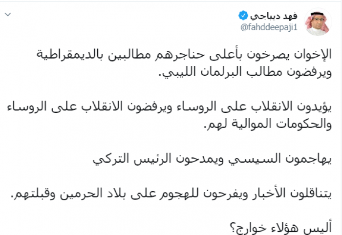 وكتب عبر تغريدة له على "تويتر" رصدها " المشهد العربي": "الإخوان يصرخون بأعلى حناجرهم مطالبين بالديمقراطية ويرفضون مطالب البرلمان الليبي، يؤيدون الانقلاب على الرؤساء ويرفضون الانقلاب على الرؤساء والحكومات الموالية لهم، يهاجمون السيسي ويمدحون الرئيس التركي يتناقلون الأخبار ويفرحون للهجوم على بلاد الحرمين وقبلتهم، أليس هؤلاء خوارج؟".