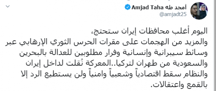 وكتب عبر تغريدة له على "تويتر" رصدها " المشهد العربي" :"اليوم أغلب محافظات إيران ستحتج، والمزيد من الهجمات على مقرات الحرس الثوري الإرهابي عبر وسائط سيبرانية وإنسانية وفرار مطلوبين للعدالة بالبحرين والسعودية من طهران لتركيا، المعركة نُقلت لداخل إيران والنظام سقط اقتصادياً وشعبياً وأمنياً ولن يستطيع الرد إلا بالقمع واعتقالات".
