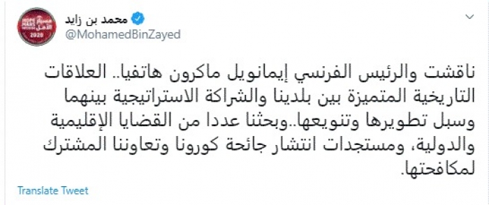 بحث ولي عهد أبوظبي نائب القائد الأعلى للقوات المسلحة الإماراتية الشيخ محمد بن زايد آل نهيان، اليوم، خلال اتصال هاتفي التعاون المشترك ومستجدات انتشار جائحة كورونا مع الرئيس الفرنسي إيمانويل ماكرون.