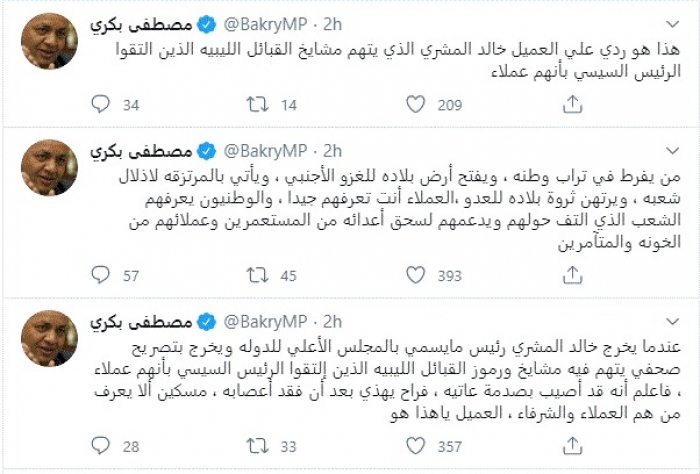وقال في تغريدات عبر "تويتر" رصدها "المشهد العربي": "عندما يخرج خالد المشري رئيس ما يسمي بالمجلس الأعلى للدولة ويخرج بتصريح صحفي يتهم فيه مشايخ ورموز القبائل الليبية الذين التقوا الرئيس السيسي بأنهم عملاء، فاعلم أنه قد أصيب بصدمة عاتية ، فراح يهذي بعد أن فقد أعصابه، مسكين ألا يعرف من هم العملاء والشرفاء".