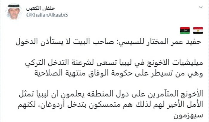 وقال في تغريدة عبر "تويتر" رصدها "المشهد العربي": "حفيد عمر المختار للسيسي: صاحب البيت لا يستأذن الدخول".