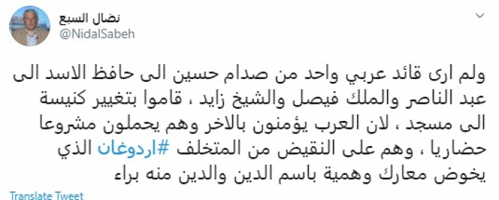 وقال في تغريدة عبر "تويتر" رصدها "المشهد العربي": "لم أرى قائد عربي واحد من صدام حسين إلى حافظ الأسد إلى عبد الناصر والملك فيصل والشيخ زايد ، قاموا بتغيير كنيسة إلى مسجد".