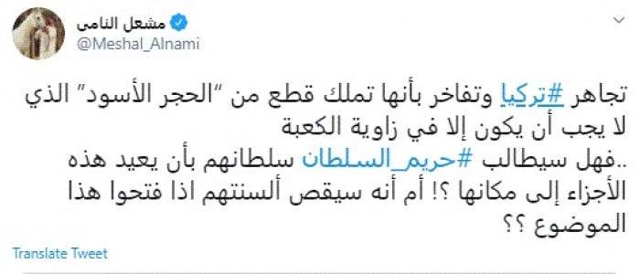وقال في تغريدة عبر "تويتر" رصدها "المشهد العربي": "تجاهر تركيا وتفاخر بأنها تملك قطع من الحجر الأسود الذي لا يجب أن يكون إلا في زاوية الكعبة".