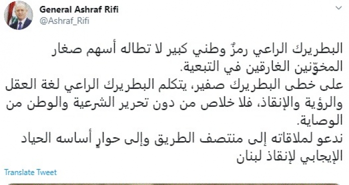 أشاد الوزير اللبناني السابق اللواء أشرف ريفي، اليوم، برأس الكنيسة المارونية في لبنان البطريرك الماروني بشارة الراعي، مؤكدًا أنه رمز وطني كبير.