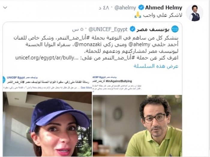 وجاءت رسالة اليونيسيف عبر الحساب الرسمي الخاص بالمنظمة بموقع "تويتر": "بنشكر كل من ساهم في التوعية بحملة أنا ضد التنمر، وشكر خاص للفنان أحمد حلمي ومنى زكي، سفراء النوايا الحسنة ليونيسيف مصر لمشاركتهم ودعمهم للحملة".