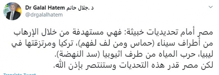 وكتب في تغريدة عبر "تويتر" رصدها "المشهد العربي": "مصر أمام تحديديات خبيثة: فهي مستهدفة من خلال الإرهاب من أطراف سيناء (حماس ومن لف لفهم)، تركيا ومرتزقتها في ليبيا، حرب المياه من طرف اثيوبيا (سد النهضة)".