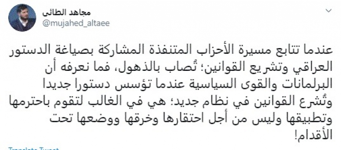 وقال في تغريدة عبر "تويتر" رصدها "المشهد العربي": "عندما تتابع مسيرة الأحزاب المتنفذة المشاركة بصياغة الدستور العراقي وتشريع القوانين؛ تُصاب بالذهول".