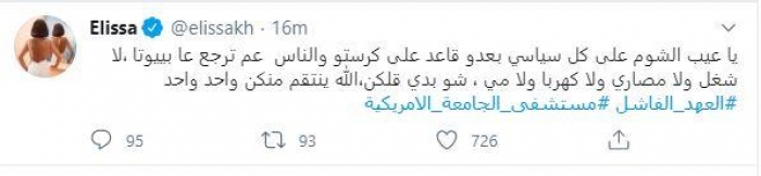 وكتبت إليسا عبر "تويتر": "يا عيب الشوم على كل سياسي بعدو قاعد على كرستو، والناس عم ترجع عا بييوتا، لا شغل ولا مصاري ولا كهربا ولا مي، شو بدي قلكن، الله ينتقم منكن واحد واحد".
