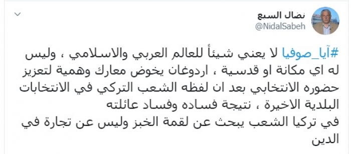 وكتب عبر تغريدة له على "تويتر" رصدها " المشهد العربي": "آيا صوفيا لا يعني شيئا للعالم العربي والإسلامي، وليس له أي مكانة أو قدسية، أردوغان يخوض معارك وهمية لتعزيز حضوره الانتخابي بعد أن لفظه الشعب التركي في الانتخابات البلدية الأخيرة ، نتيجة فساده وفساد عائلته، في تركيا الشعب يبحث عن لقمة الخبز وليس عن تجارة في الدين".