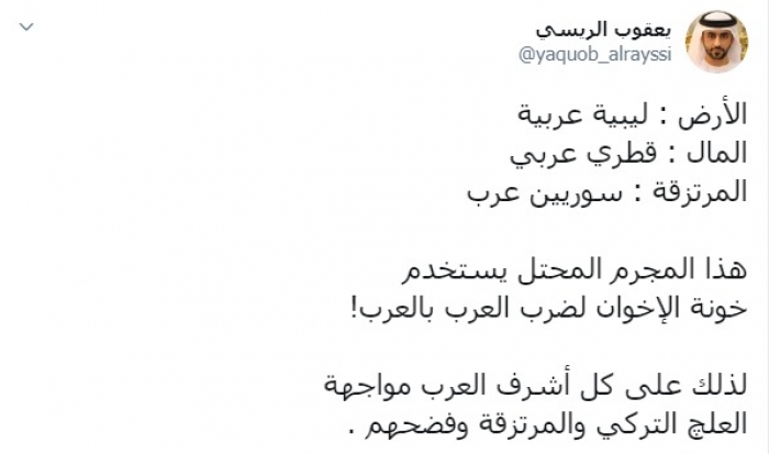 وكتب عبر تغريدة له على "تويتر" رصدها " المشهد العربي": "الأرض، ليبية عربية، المال، قطري عربي، المرتزقة، سوريين عرب، هذا المجرم المحتل يستخدم خونة الإخوان لضرب العرب بالعرب".
