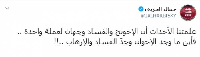 وكتب عبر تغريدة له على "تويتر" رصدها "المشهد العربي": "علمتنا الأحداث أن الإخونج والفساد وجهان لعملة واحدة، فأين ما وجد الإخوان وجدَ الفساد والإرهاب".