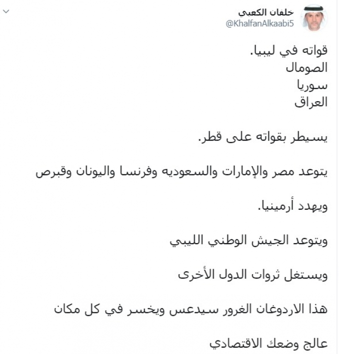 وكتب عبر تغريدة له على "تويتر" رصدها " المشهد العربي": "قواته في ليبيا، الصومال، سوريا، العراق، يسيطر بقواته على قطر،يتوعد مصر والإمارات والسعودية وفرنسا واليونان وقبرص ويهدد أرمينيا، ويتوعد الجيش الوطني الليبي ويستغل ثروات الدول الأخرى".