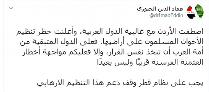 وكتب عبر تغريدة له على "تويتر" رصدها " المشهد العربي": "اصطفت الأردن مع غالبية الدول العربية، وأعلنت حظر تنظيم الإخوان المسلمون على أراضيها، فعلى الدول المتبقية من أمة العرب أن تتخذ نفس القرار، وإلا فعليكم مواجهة أخطار العثمنة و الفرسنة قريبًا وليس بعيدًا، يجب على نظام قطر وقف دعم هذا التنظيم الإرهابي".