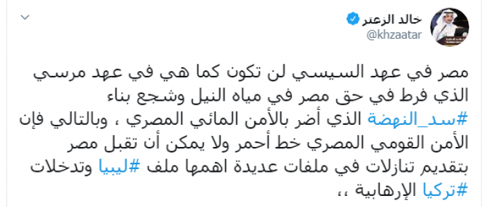 وكتب عبر تغريدة له على "تويتر" رصدها " المشهد العربي": "مصر في عهد السيسي لن تكون كما هي في عهد مرسي الذي فرط في حق مصر في مياه النيل وشجع بناء سد النهضة الذي أضر بالأمن المائي المصري، وبالتالي فإن الأمن القومي المصري خط أحمر ولا يمكن أن تقبل مصر بتقديم تنازلات في ملفات عديدة أهمها ملف ليبيا وتدخلات تركيا الإرهابية".