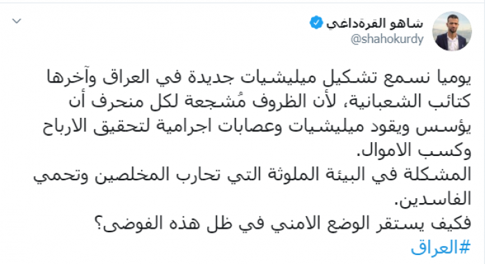وكتب عبر تغريدة له على "تويتر" رصدها " المشهد العربي": "يوميا نسمع تشكيل ميليشيات جديدة في العراق، وآخرها كتائب الشعبانية، لأن الظروف مُشجعة لكل منحرف أن يؤسس ويقود مليشيات وعصابات إجرامية لتحقيق الأرباح وكسب الأموال".