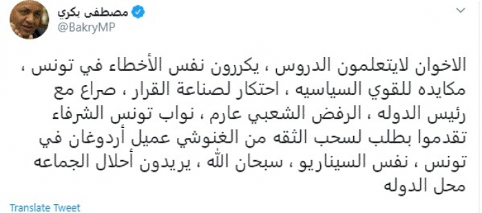 بكري: الإخوان لا يتعلمون الدروس.. ويكررون نفس الأخطاء في تونس