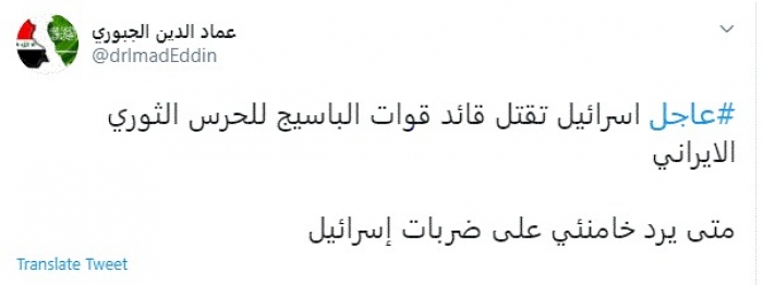 وقال في تغريدة عبر "تويتر" رصدها "المشهد العربي": "عاجل إسرائيل تقتل قائد قوات الباسيج للحرس الثوري الإيراني متى يرد خامنئي على ضربات إسرائيل".