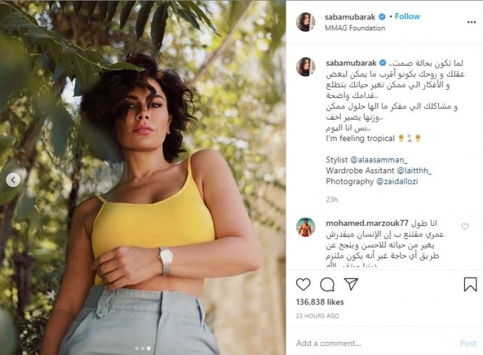 ونشرت صبا صورًا جيددة لها وهي في حالة من التأمل والصمت، وعلقت: "لما تكون بحالة صمت.. عقلك وروحك بيكونوا أقرب ما يمكن لبعض.. والأفكار اللي ممكن تغير حياتك، بتطلع قدامك واضحة، ومشاكلك اللي مفكر ما لها حلول، ممكن وزنها يصير أخف".