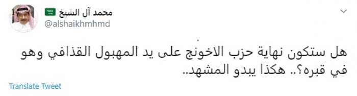 وقال في تغريدة عبر "تويتر" رصدها "المشهد العربي": "هل ستكون نهاية حزب الإخونج على يد .... القذافي وهو في قبره؟.. هكذا يبدو المشهد".