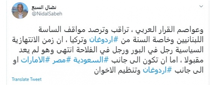 طالب المحلل السياسي اللبناني نضال السبع، اليوم، الساسة اللبنانيين بالانحياز لجانب السعودية والإمارات ومصر، وعدم الارتهان للرئيس التركي رجب طيب أردوغان وتنظيم الإخوان.